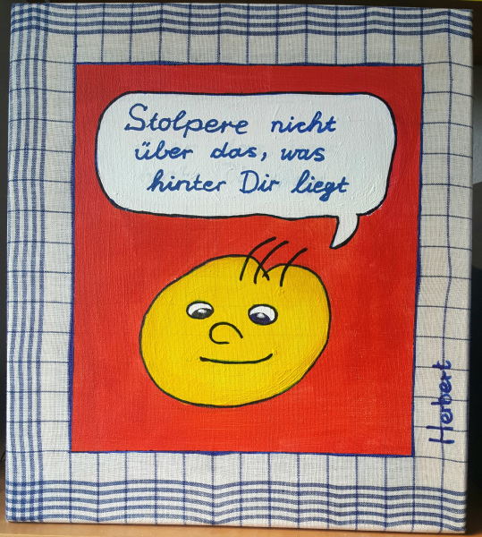 Material: auf Keilrahmen gespanntes Geschirrtuch, mit Acrylfarbe und -stift bemalt, gefirnißt.
